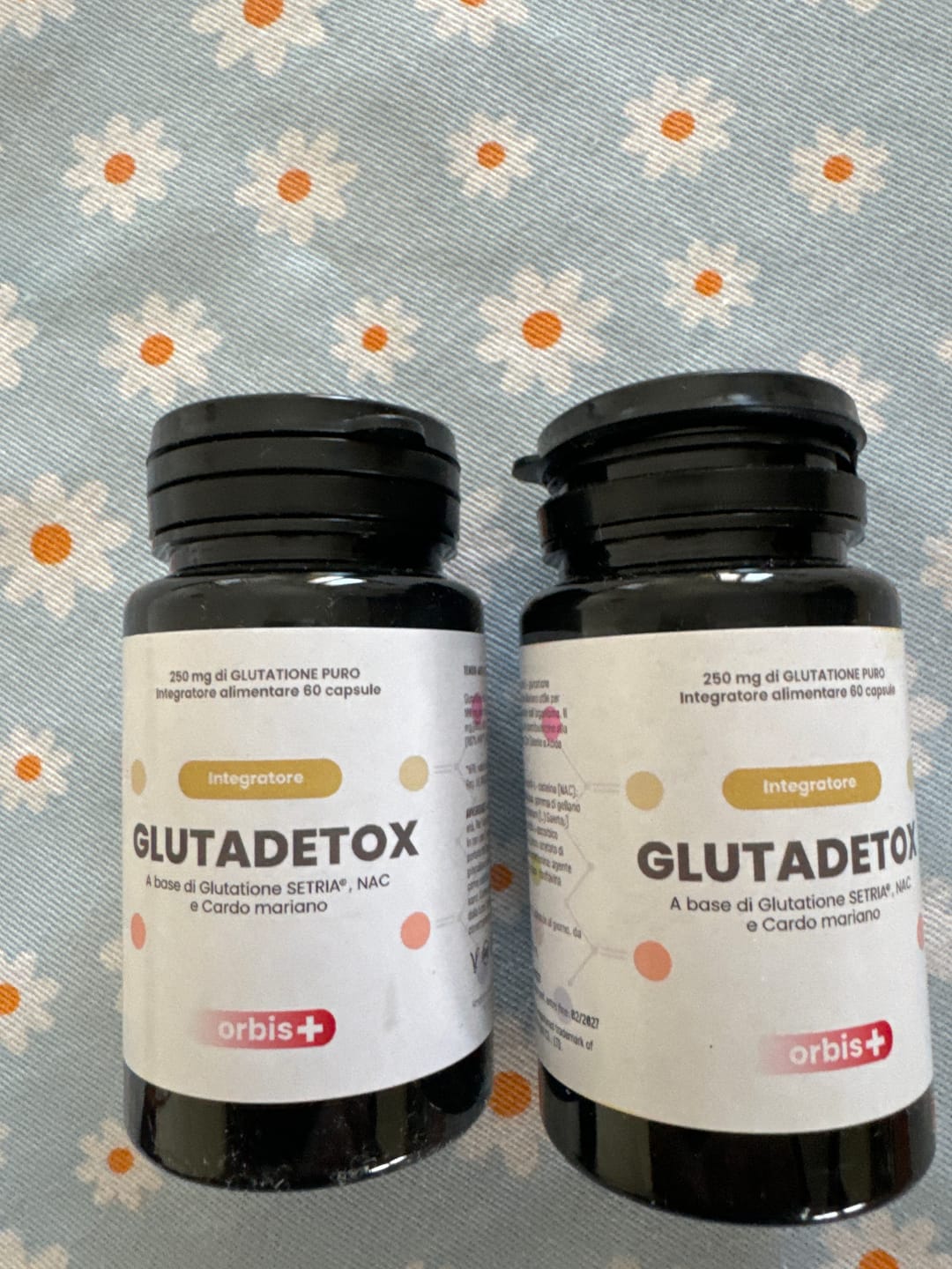 GLUTADETOX fornisce SETRIA® Glutatione ridotto (250 mg), N-Acetil-L-Cisteina (200 mg), Cardo Mariano (Silybum marianum) estratto di frutto titolato all’80% in silimarina, Acido Alfa-Lipoico (50 mg), Vitamina C (80 mg – 100% NRV), Vitamina E (12 mg – 100% NRV), Vitamina B2 (1,4 mg – 100% NRV) e Selenio (100 mcg – 182% NRV).