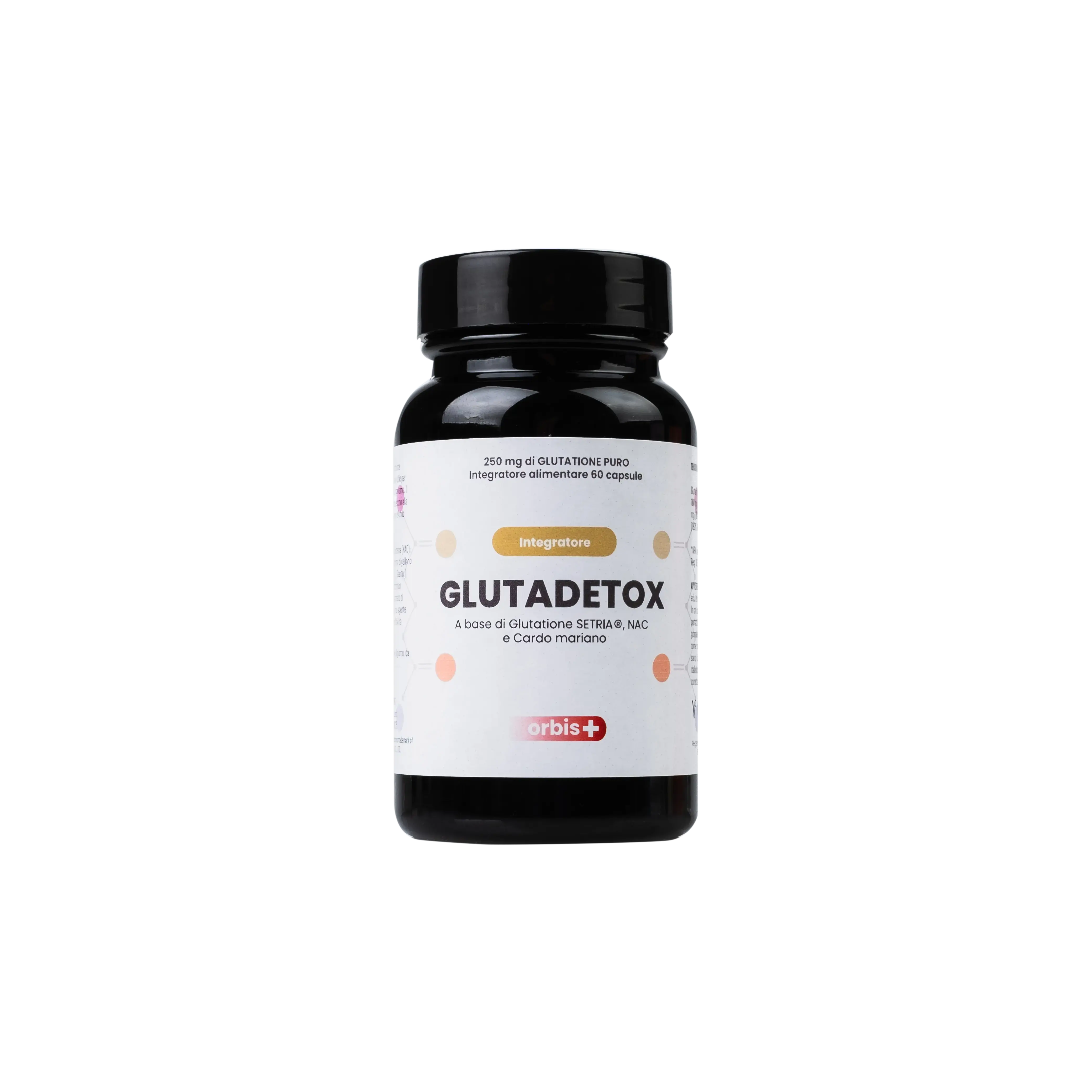 GLUTADETOX fornisce SETRIA® Glutatione ridotto (250 mg), N-Acetil-L-Cisteina (200 mg), Cardo Mariano (Silybum marianum) estratto di frutto titolato all’80% in silimarina, Acido Alfa-Lipoico (50 mg), Vitamina C (80 mg – 100% NRV), Vitamina E (12 mg – 100% NRV), Vitamina B2 (1,4 mg – 100% NRV) e Selenio (100 mcg – 182% NRV).