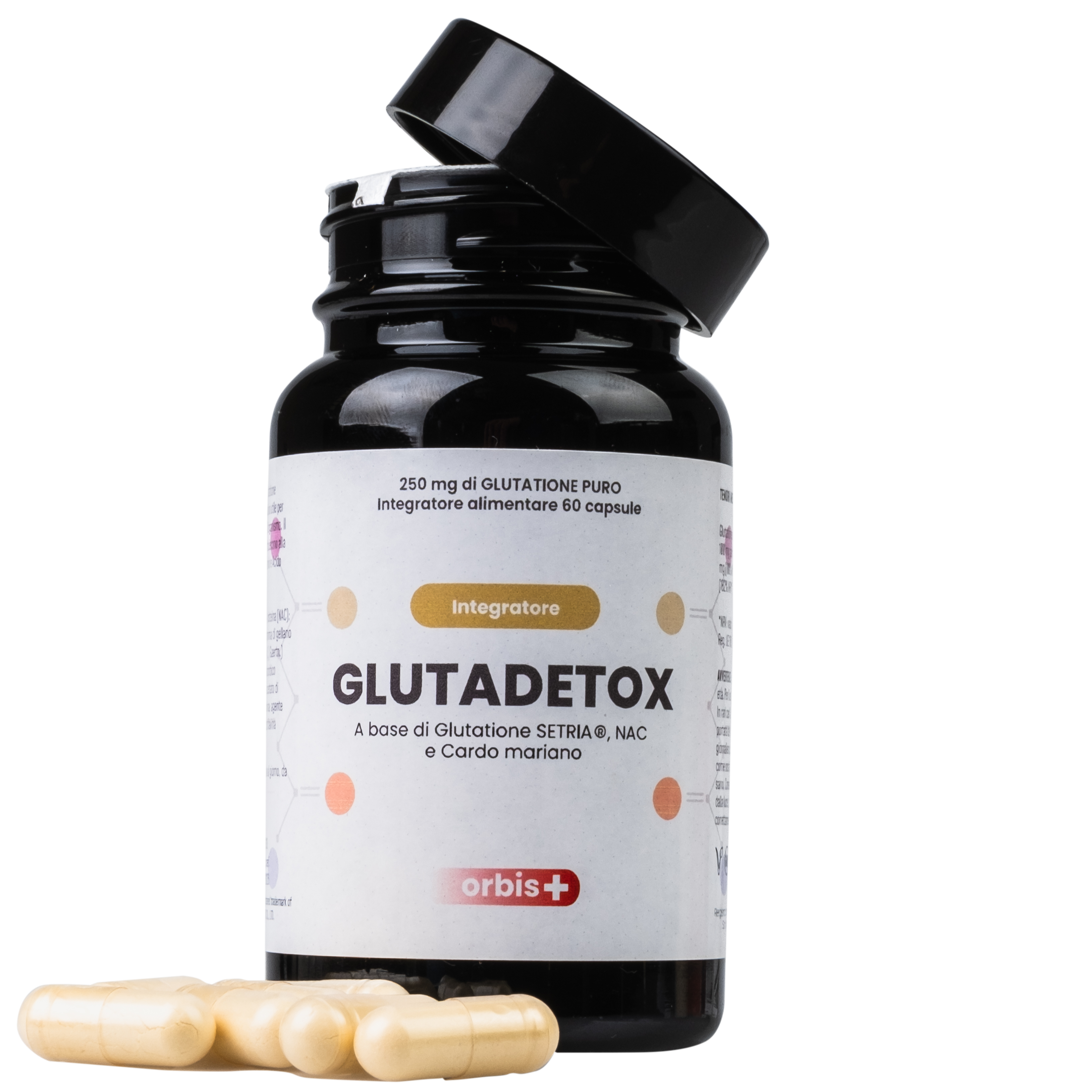 GLUTADETOX fornisce SETRIA® Glutatione ridotto (250 mg), N-Acetil-L-Cisteina (200 mg), Cardo Mariano (Silybum marianum) estratto di frutto titolato all’80% in silimarina, Acido Alfa-Lipoico (50 mg), Vitamina C (80 mg – 100% NRV), Vitamina E (12 mg – 100% NRV), Vitamina B2 (1,4 mg – 100% NRV) e Selenio (100 mcg – 182% NRV).