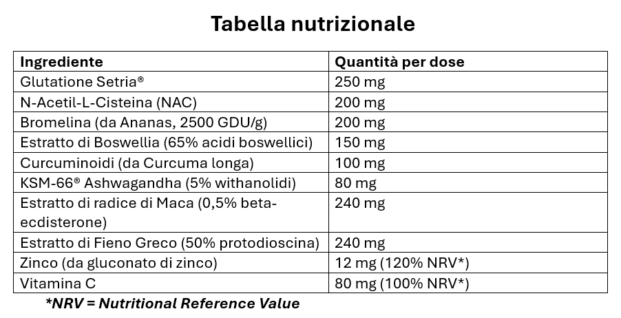 Este paquete combina tres suplementos complementarios para el equilibrio y la resistencia del sistema inmunitario. TESTOWIT proporciona 560 mg de Muira Puama, 400 mg de remolacha RedNite™, 240 mg de Maca, 240 mg de Fenogreco (50% de protodioscina), 80 mg de KSM-66® Ashwagandha, además de zinc y antioxidantes para apoyar las hormonas y la energía. RESET aporta bromelina (2500 GDU/g), 65% de ácidos boswélicos de Boswellia, curcuminoides, corteza de pino (90% de proantocianidinas) y nattoquinasa para reducir la inflamación, mejorar la circulación y proteger el corazón. GLUTADETOX incluye 250 mg de Setria® Glutatión, 200 mg de NAC, 150 mg de cardo mariano (80% de silimarina), vitamina C, ácido lipoico, vitamina E, selenio y vitamina B2 para depurar el hígado y contrarrestar el estrés oxidativo.